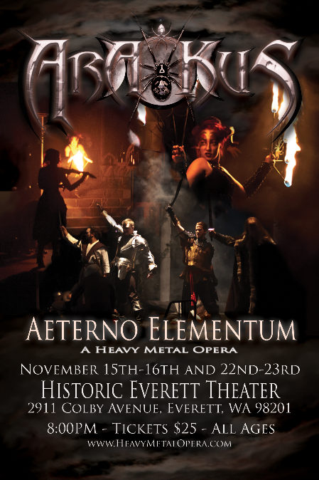 Seattle's only Heavy Metal Opera, Aeterno Elementum, is returning to the stage this November at the Historic Everett Theater. On November 15th, 16th, 22nd and 23rd, Ara'Kus Productions will once again be performing its dark, atmospheric tale of betrayal, fate, and the end of the world in Aeterno Elementum's third successive year on stage